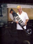 Our mentor, Vinicio Grossi, with gondola builder Roberto Dei Rossi in the reflection of the ferro.